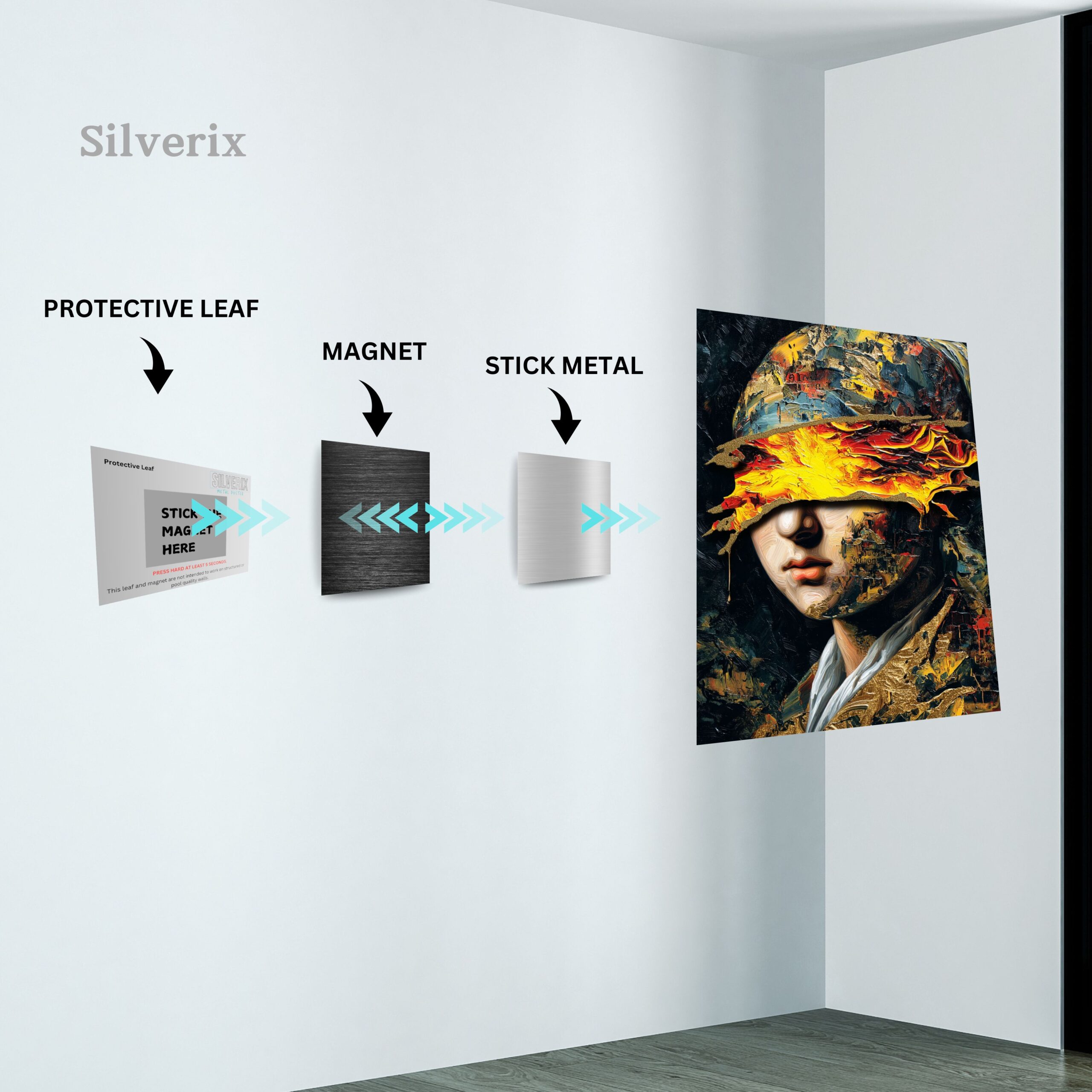 ⚠️ Ensure the position is final before applying, as the adhesive is strong. Step 4: Attach the Poster Magnet Attach the matching magnet securely to the back of the aluminium poster. Ensure correct alignment with the wall magnet. Step 5: Mount the Poster Align the poster magnet with the wall magnet. Gently place the poster onto the wall. The magnets will connect automatically, holding the poster securely.