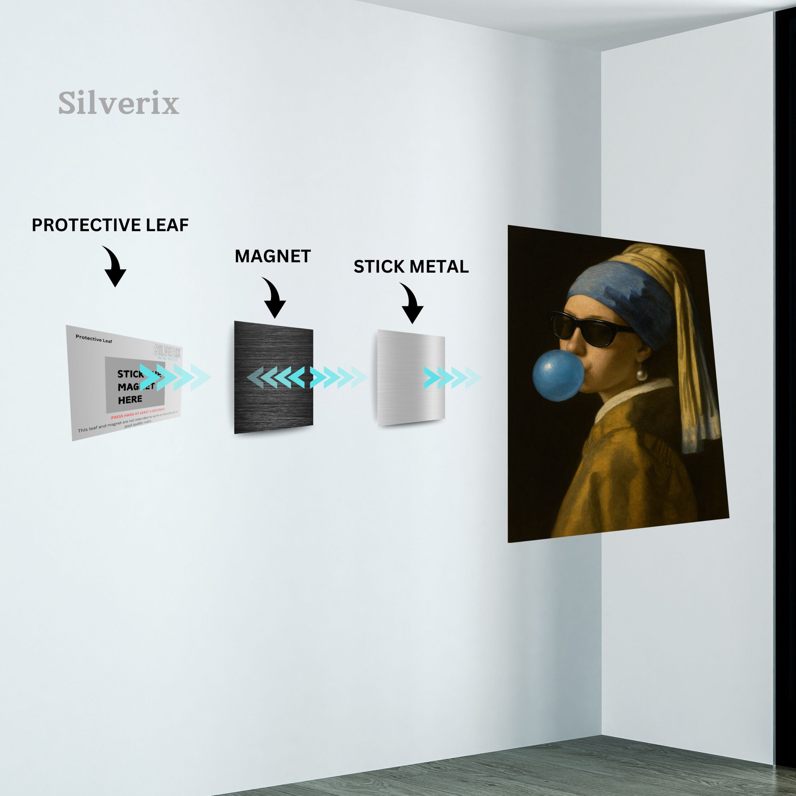 ⚠️ Ensure the position is final before applying, as the adhesive is strong. Step 4: Attach the Poster Magnet Attach the matching magnet securely to the back of the aluminium poster. Ensure correct alignment with the wall magnet. Step 5: Mount the Poster Align the poster magnet with the wall magnet. Gently place the poster onto the wall. The magnets will connect automatically, holding the poster securely.