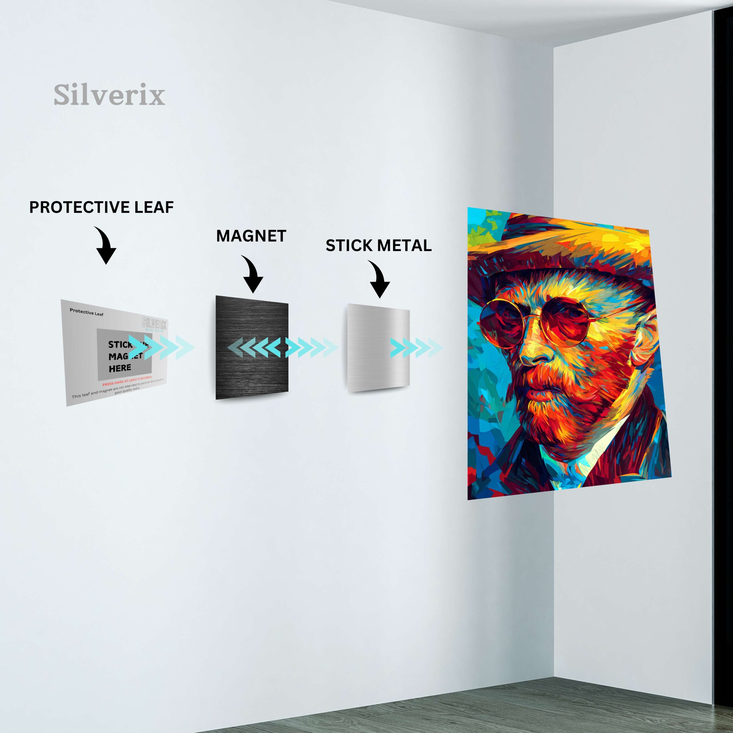 ⚠️ Ensure the position is final before applying, as the adhesive is strong. Step 4: Attach the Poster Magnet Attach the matching magnet securely to the back of the aluminium poster. Ensure correct alignment with the wall magnet. Step 5: Mount the Poster Align the poster magnet with the wall magnet. Gently place the poster onto the wall. The magnets will connect automatically, holding the poster securely.