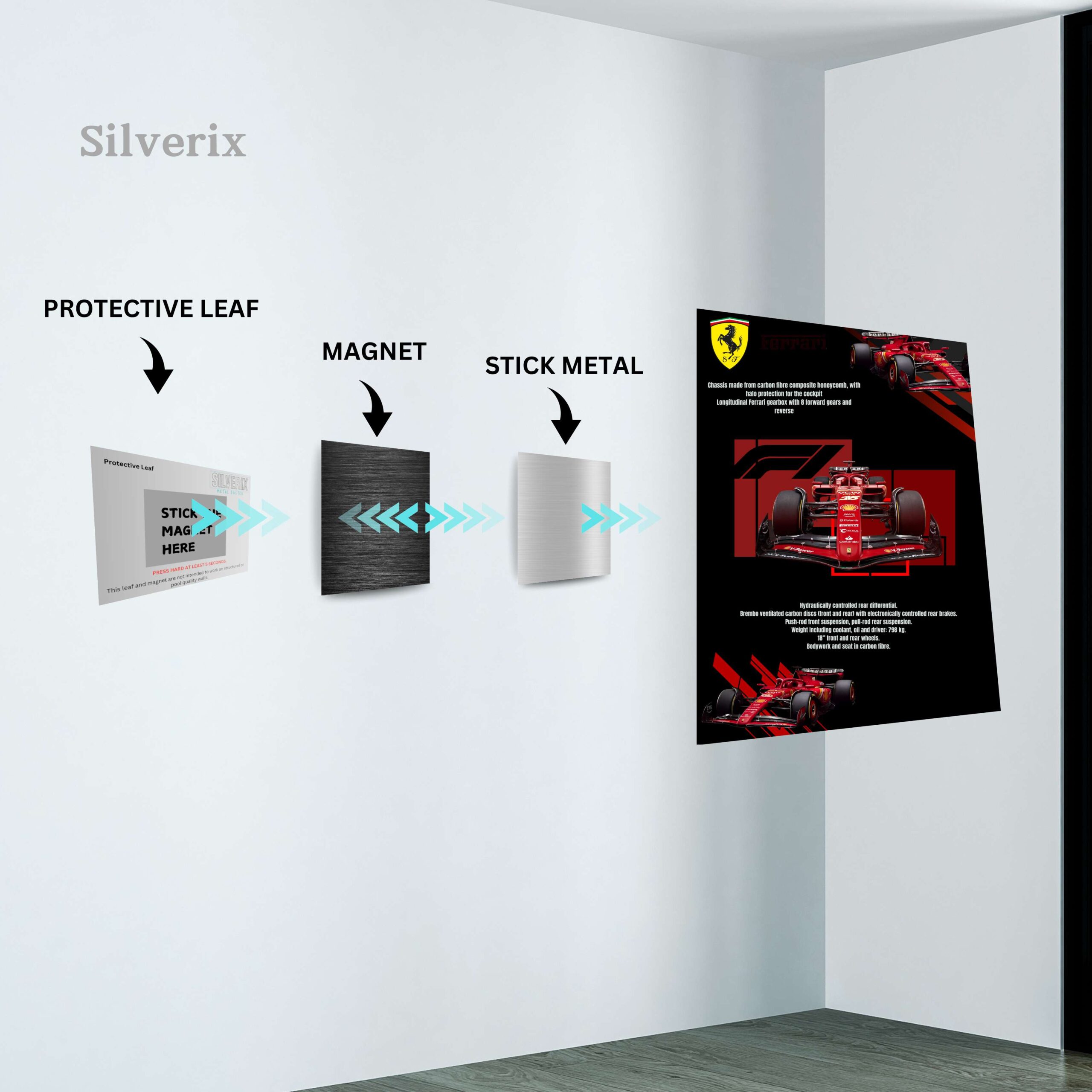 ⚠️ Ensure the position is final before applying, as the adhesive is strong. Step 4: Attach the Poster Magnet Attach the matching magnet securely to the back of the aluminium poster. Ensure correct alignment with the wall magnet. Step 5: Mount the Poster Align the poster magnet with the wall magnet. Gently place the poster onto the wall. The magnets will connect automatically, holding the poster securely.