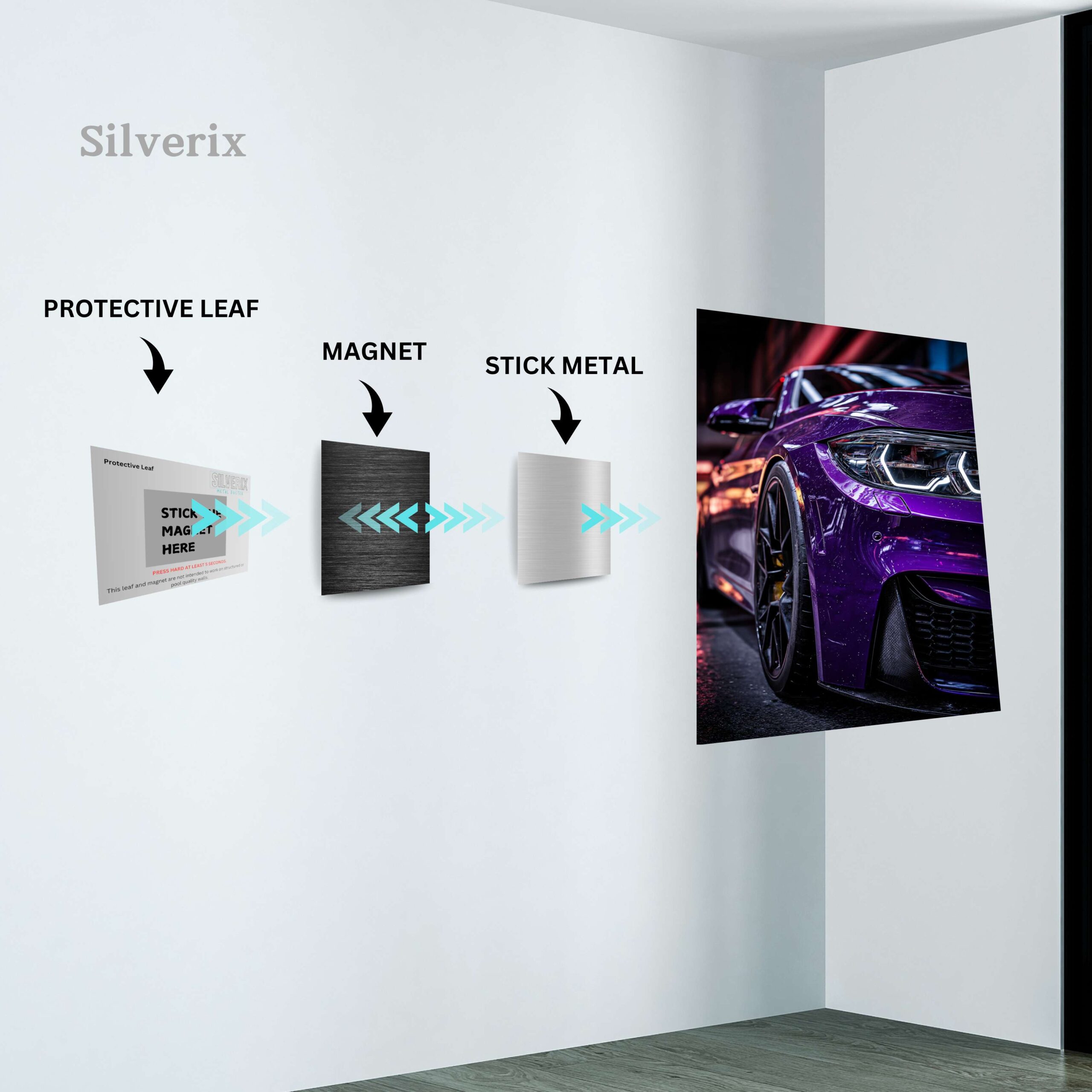 ⚠️ Ensure the position is final before applying, as the adhesive is strong. Step 4: Attach the Poster Magnet Attach the matching magnet securely to the back of the aluminium poster. Ensure correct alignment with the wall magnet. Step 5: Mount the Poster Align the poster magnet with the wall magnet. Gently place the poster onto the wall. The magnets will connect automatically, holding the poster securely.