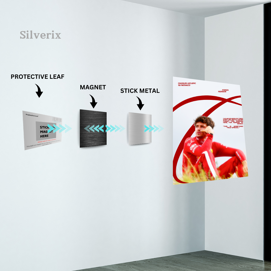 ⚠️ Ensure the position is final before applying, as the adhesive is strong. Step 4: Attach the Poster Magnet Attach the matching magnet securely to the back of the aluminium poster. Ensure correct alignment with the wall magnet. Step 5: Mount the Poster Align the poster magnet with the wall magnet. Gently place the poster onto the wall. The magnets will connect automatically, holding the poster securely.