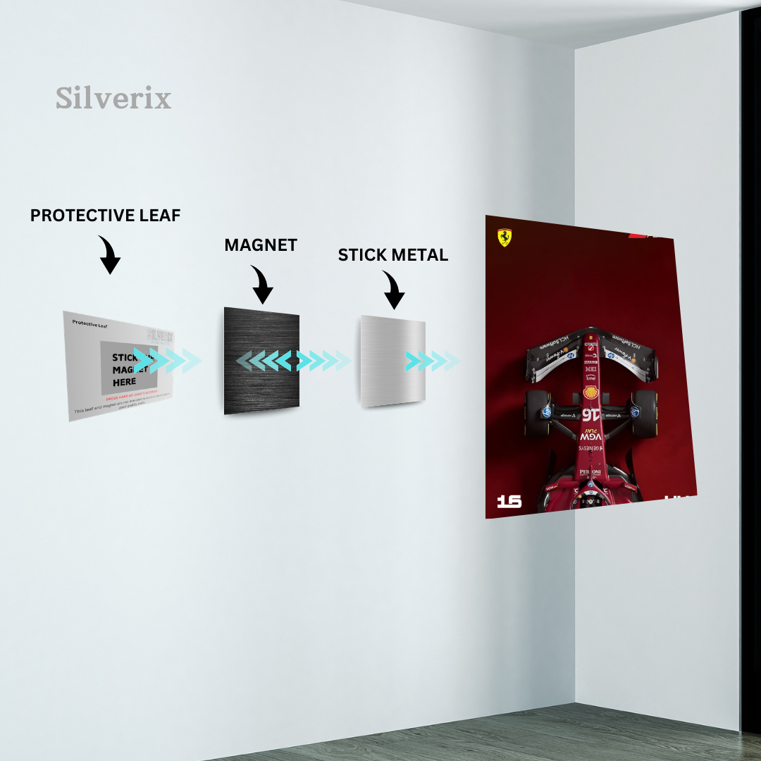 ⚠️ Ensure the position is final before applying, as the adhesive is strong. Step 4: Attach the Poster Magnet Attach the matching magnet securely to the back of the aluminium poster. Ensure correct alignment with the wall magnet. Step 5: Mount the Poster Align the poster magnet with the wall magnet. Gently place the poster onto the wall. The magnets will connect automatically, holding the poster securely.