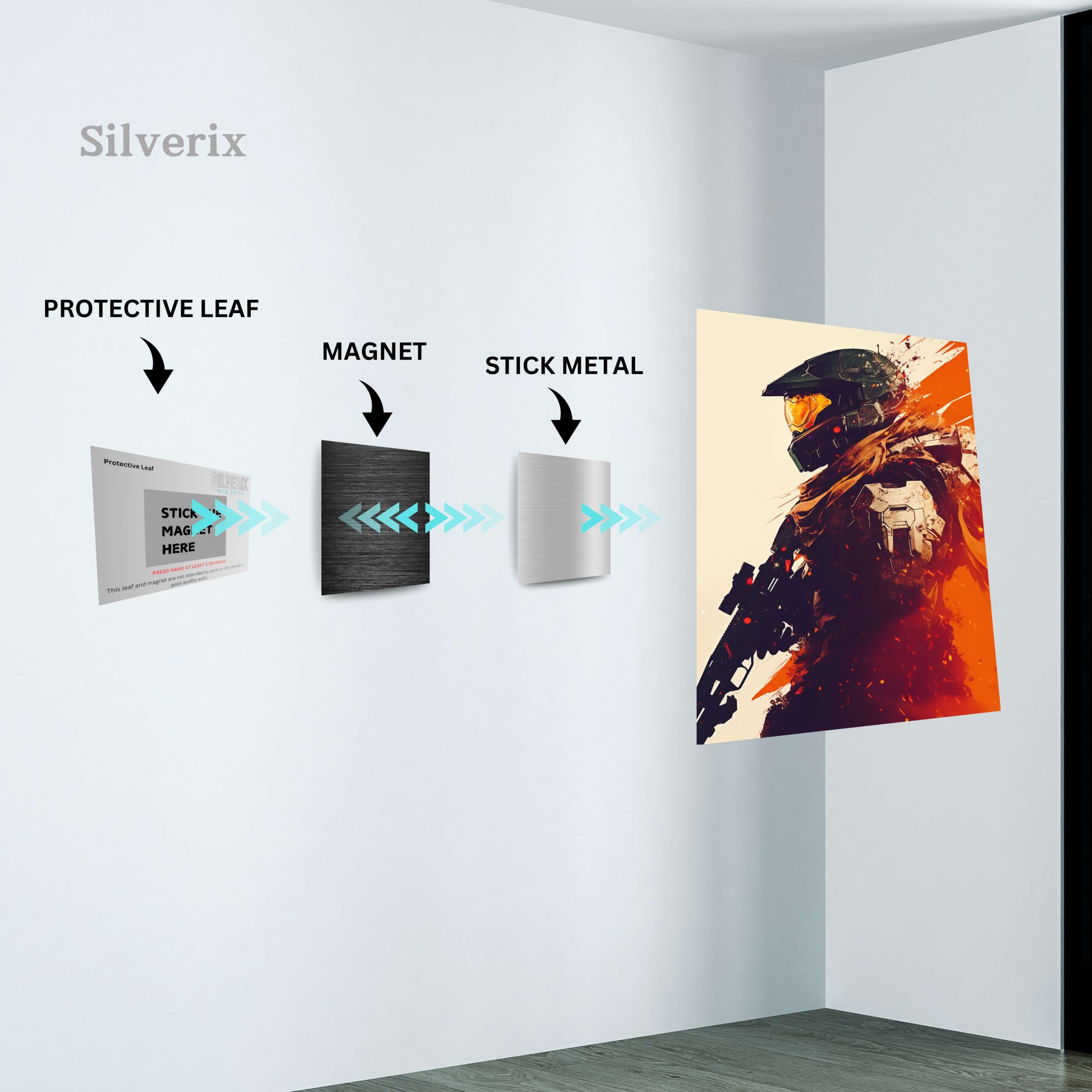 ⚠️ Ensure the position is final before applying, as the adhesive is strong. Step 4: Attach the Poster Magnet Attach the matching magnet securely to the back of the aluminium poster. Ensure correct alignment with the wall magnet. Step 5: Mount the Poster Align the poster magnet with the wall magnet. Gently place the poster onto the wall. The magnets will connect automatically, holding the poster securely.