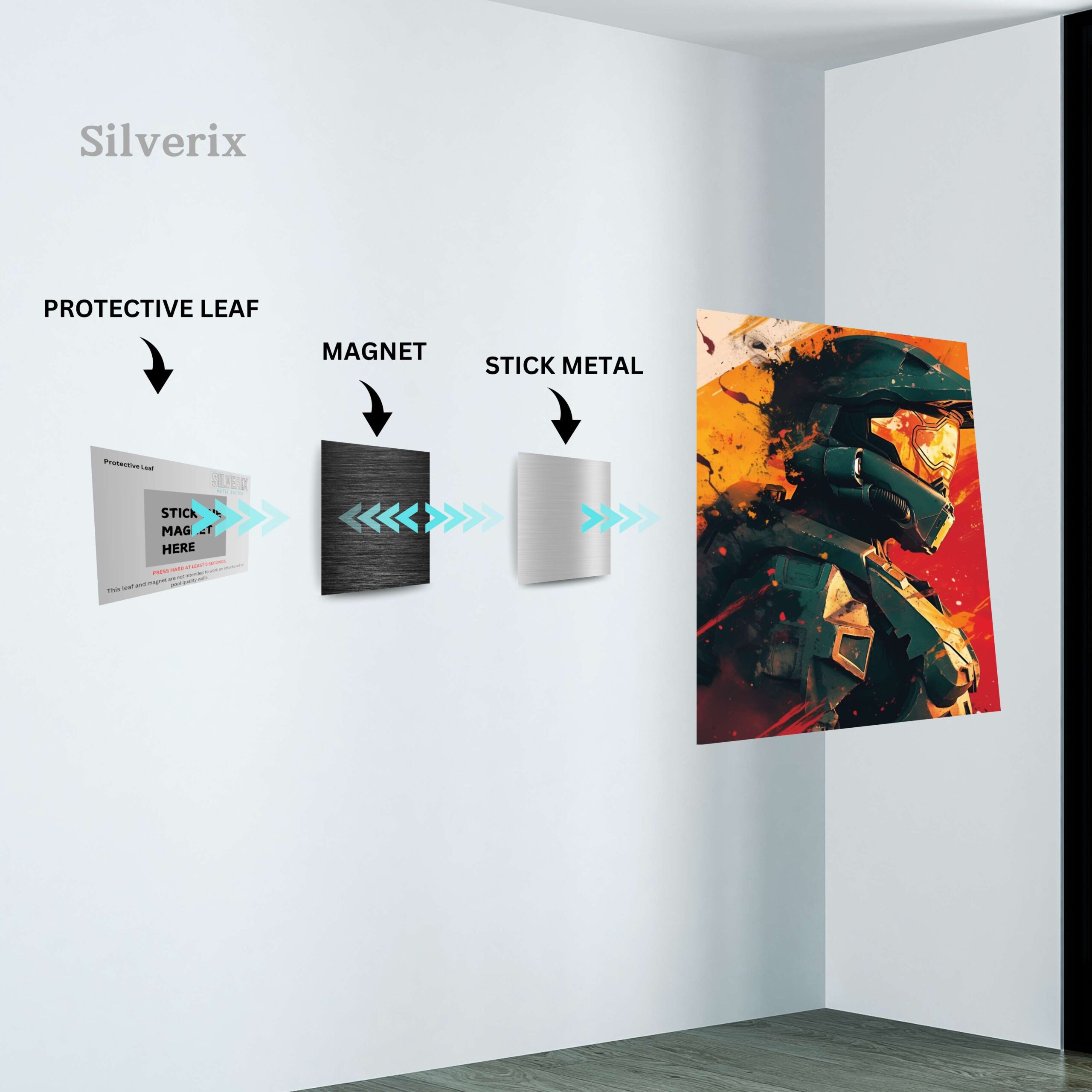⚠️ Ensure the position is final before applying, as the adhesive is strong. Step 4: Attach the Poster Magnet Attach the matching magnet securely to the back of the aluminium poster. Ensure correct alignment with the wall magnet. Step 5: Mount the Poster Align the poster magnet with the wall magnet. Gently place the poster onto the wall. The magnets will connect automatically, holding the poster securely.
