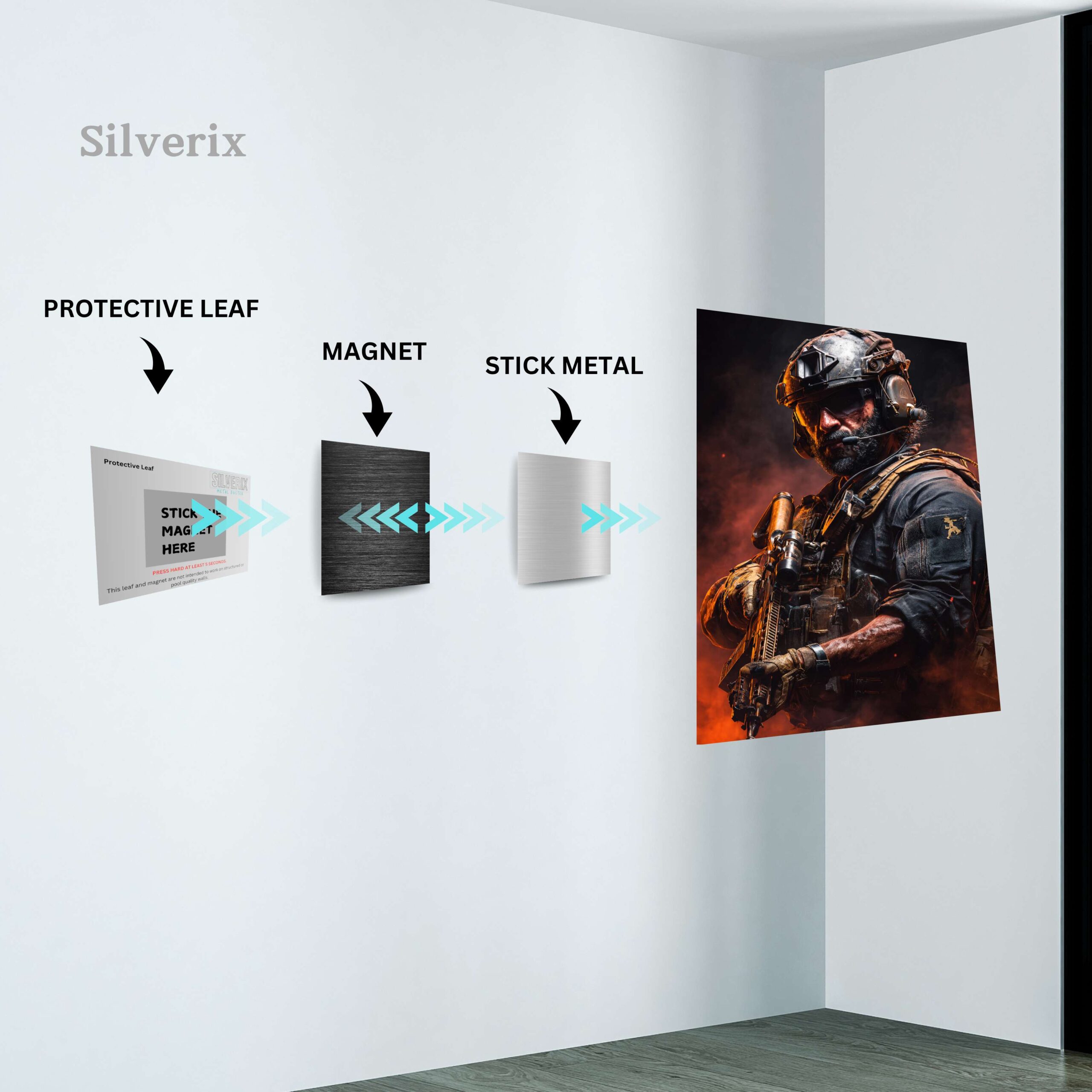 ⚠️ Ensure the position is final before applying, as the adhesive is strong. Step 4: Attach the Poster Magnet Attach the matching magnet securely to the back of the aluminium poster. Ensure correct alignment with the wall magnet. Step 5: Mount the Poster Align the poster magnet with the wall magnet. Gently place the poster onto the wall. The magnets will connect automatically, holding the poster securely.