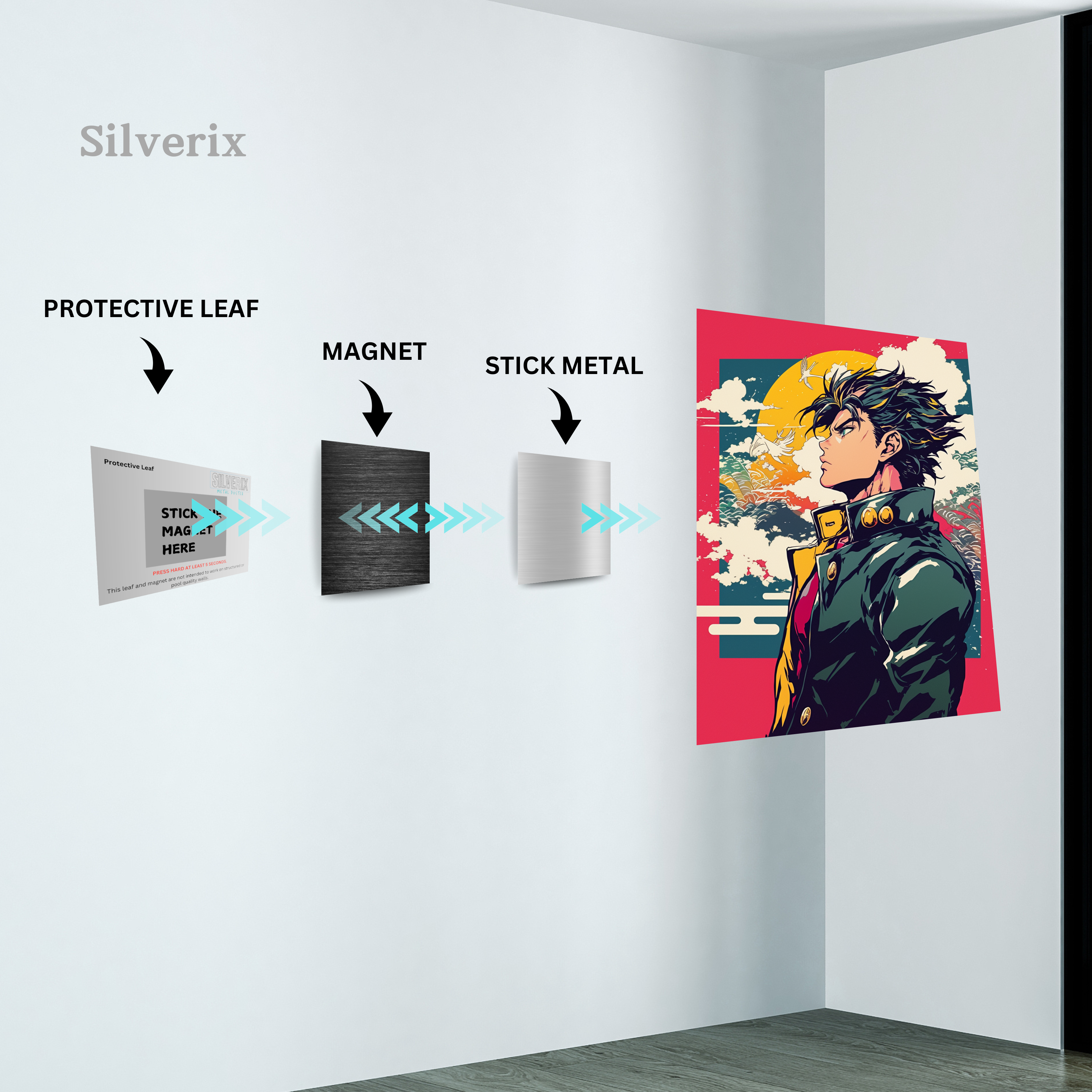 ⚠️ Ensure the position is final before applying, as the adhesive is strong. Step 4: Attach the Poster Magnet Attach the matching magnet securely to the back of the aluminium poster. Ensure correct alignment with the wall magnet. Step 5: Mount the Poster Align the poster magnet with the wall magnet. Gently place the poster onto the wall. The magnets will connect automatically, holding the poster securely.