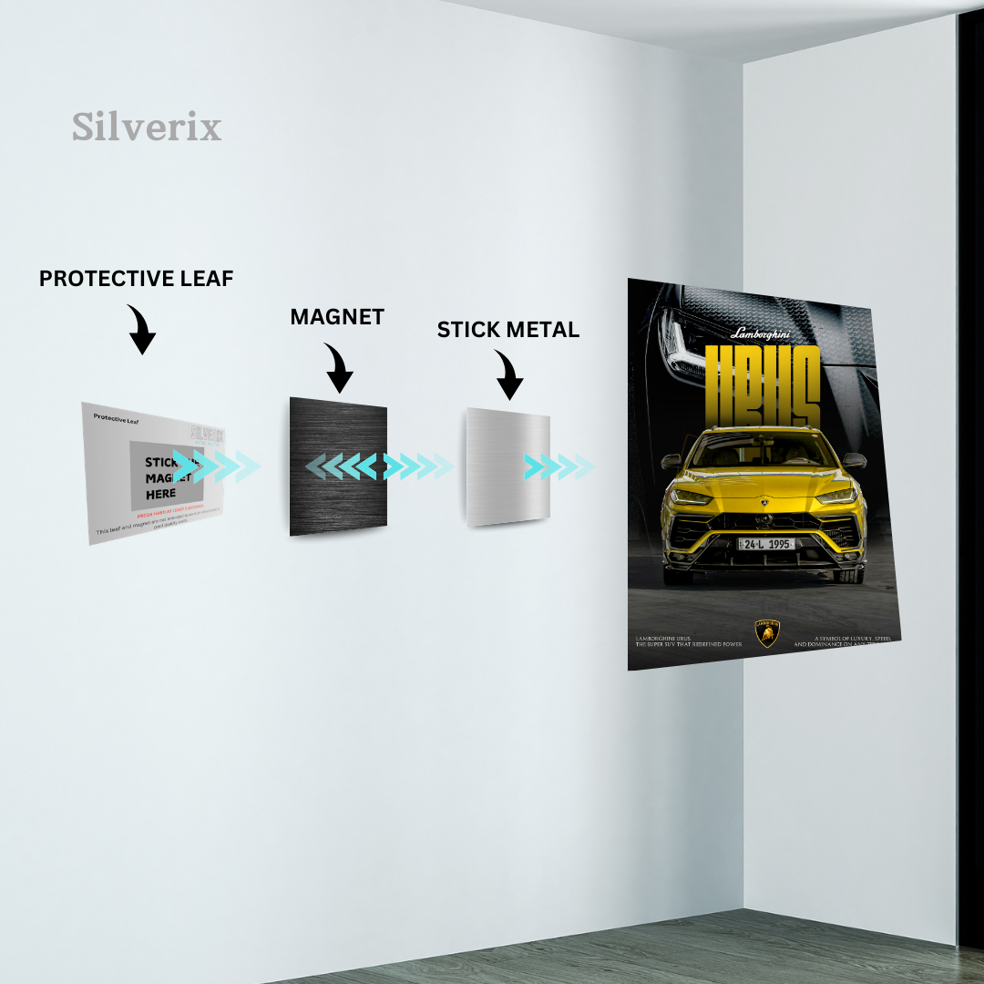 ⚠️ Ensure the position is final before applying, as the adhesive is strong. Step 4: Attach the Poster Magnet Attach the matching magnet securely to the back of the aluminium poster. Ensure correct alignment with the wall magnet. Step 5: Mount the Poster Align the poster magnet with the wall magnet. Gently place the poster onto the wall. The magnets will connect automatically, holding the poster securely.