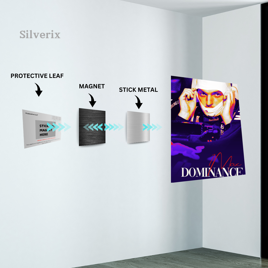Crafted for Durability & Elegance – Printed on sturdy aluminium with a modern matte finish, your custom metal poster boasts crisp colours and sharp details. The magnetic mounting system ensures easy, damage-free display, allowing you to mount and move your poster in seconds.