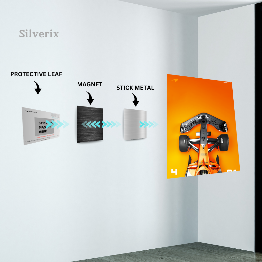 ⚠️ Ensure the position is final before applying, as the adhesive is strong. Step 4: Attach the Poster Magnet Attach the matching magnet securely to the back of the aluminium poster. Ensure correct alignment with the wall magnet. Step 5: Mount the Poster Align the poster magnet with the wall magnet. Gently place the poster onto the wall. The magnets will connect automatically, holding the poster securely.