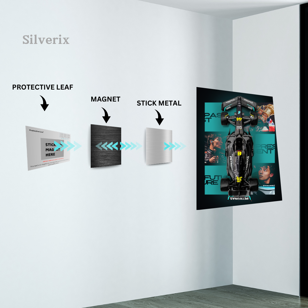 ⚠️ Ensure the position is final before applying, as the adhesive is strong. Step 4: Attach the Poster Magnet Attach the matching magnet securely to the back of the aluminium poster. Ensure correct alignment with the wall magnet. Step 5: Mount the Poster Align the poster magnet with the wall magnet. Gently place the poster onto the wall. The magnets will connect automatically, holding the poster securely.