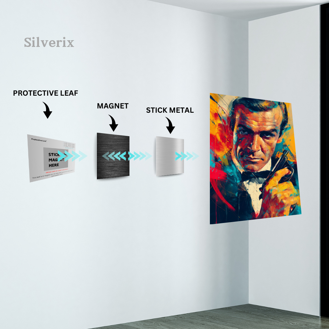 ⚠️ Ensure the position is final before applying, as the adhesive is strong. Step 4: Attach the Poster Magnet Attach the matching magnet securely to the back of the aluminium poster. Ensure correct alignment with the wall magnet. Step 5: Mount the Poster Align the poster magnet with the wall magnet. Gently place the poster onto the wall. The magnets will connect automatically, holding the poster securely.