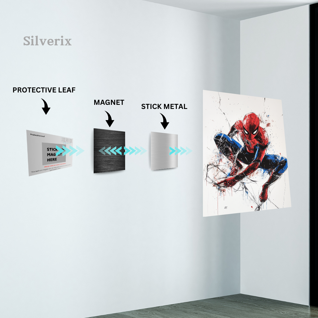 ⚠️ Ensure the position is final before applying, as the adhesive is strong. Step 4: Attach the Poster Magnet Attach the matching magnet securely to the back of the aluminium poster. Ensure correct alignment with the wall magnet. Step 5: Mount the Poster Align the poster magnet with the wall magnet. Gently place the poster onto the wall. The magnets will connect automatically, holding the poster securely.