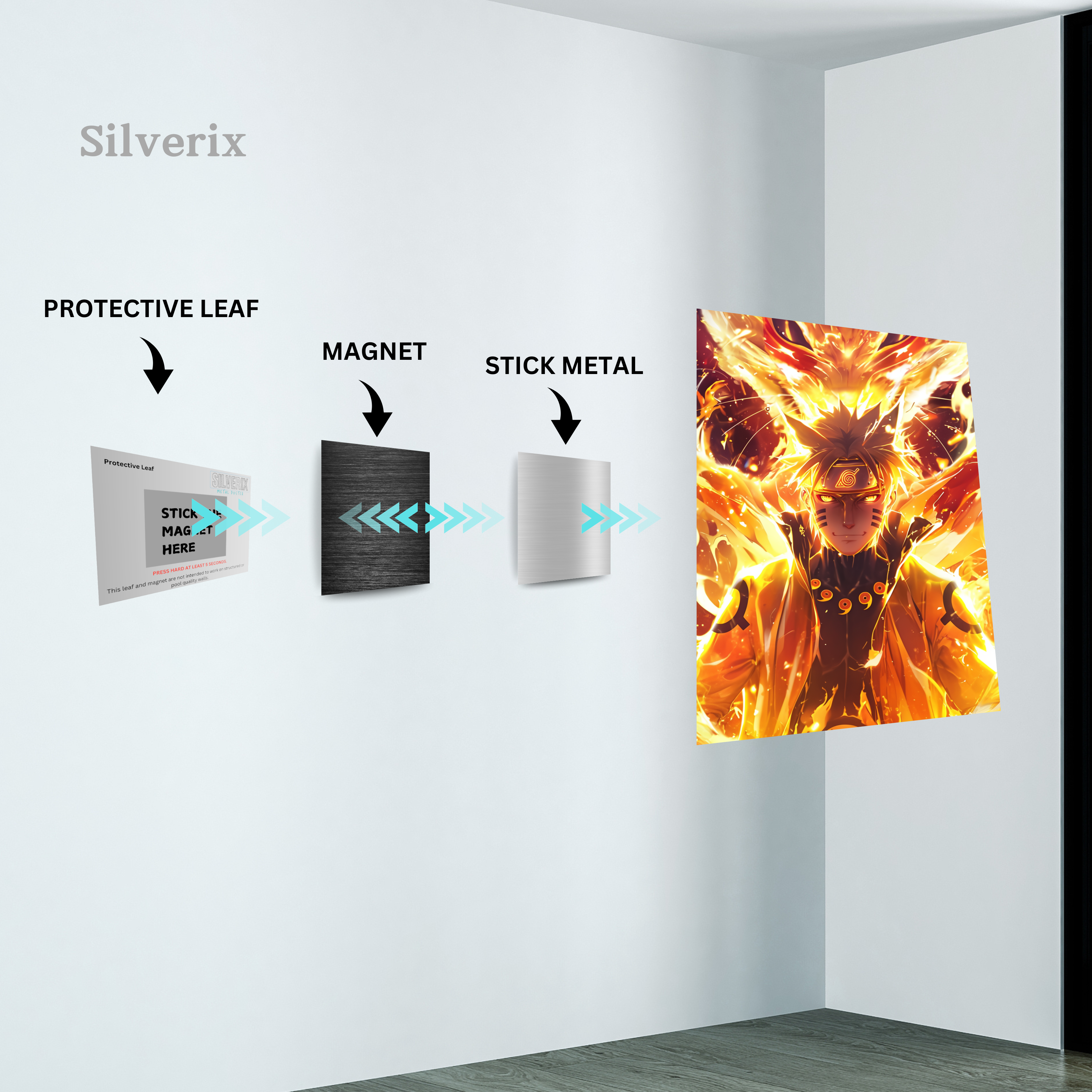 ⚠️ Ensure the position is final before applying, as the adhesive is strong. Step 4: Attach the Poster Magnet Attach the matching magnet securely to the back of the aluminium poster. Ensure correct alignment with the wall magnet. Step 5: Mount the Poster Align the poster magnet with the wall magnet. Gently place the poster onto the wall. The magnets will connect automatically, holding the poster securely.