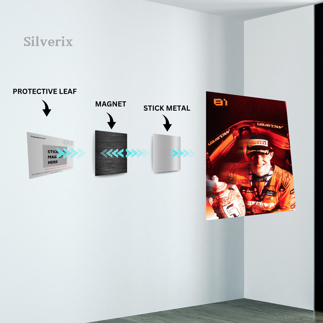 ⚠️ Ensure the position is final before applying, as the adhesive is strong. Step 4: Attach the Poster Magnet Attach the matching magnet securely to the back of the aluminium poster. Ensure correct alignment with the wall magnet. Step 5: Mount the Poster Align the poster magnet with the wall magnet. Gently place the poster onto the wall. The magnets will connect automatically, holding the poster securely.