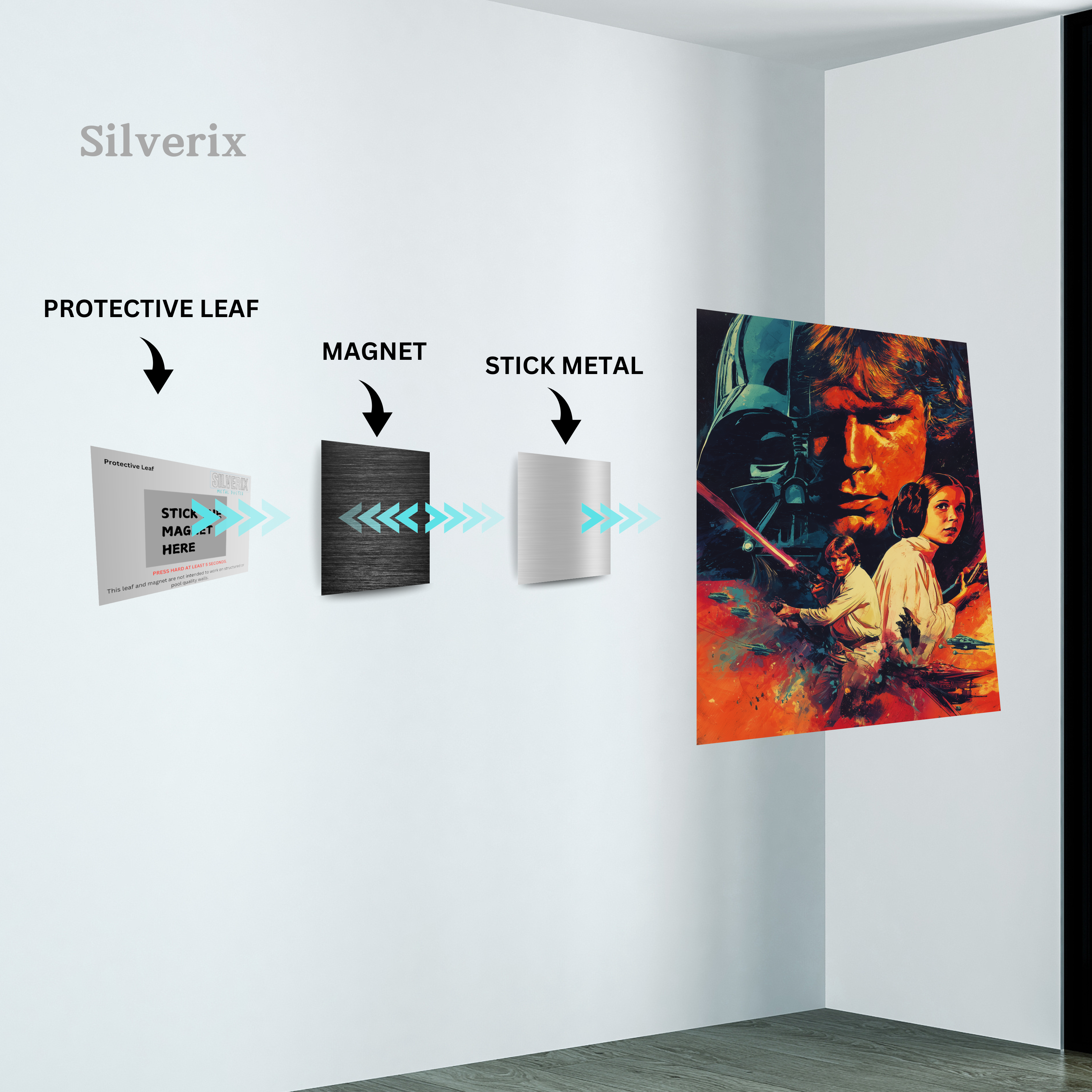 ⚠️ Ensure the position is final before applying, as the adhesive is strong. Step 4: Attach the Poster Magnet Attach the matching magnet securely to the back of the aluminium poster. Ensure correct alignment with the wall magnet. Step 5: Mount the Poster Align the poster magnet with the wall magnet. Gently place the poster onto the wall. The magnets will connect automatically, holding the poster securely.