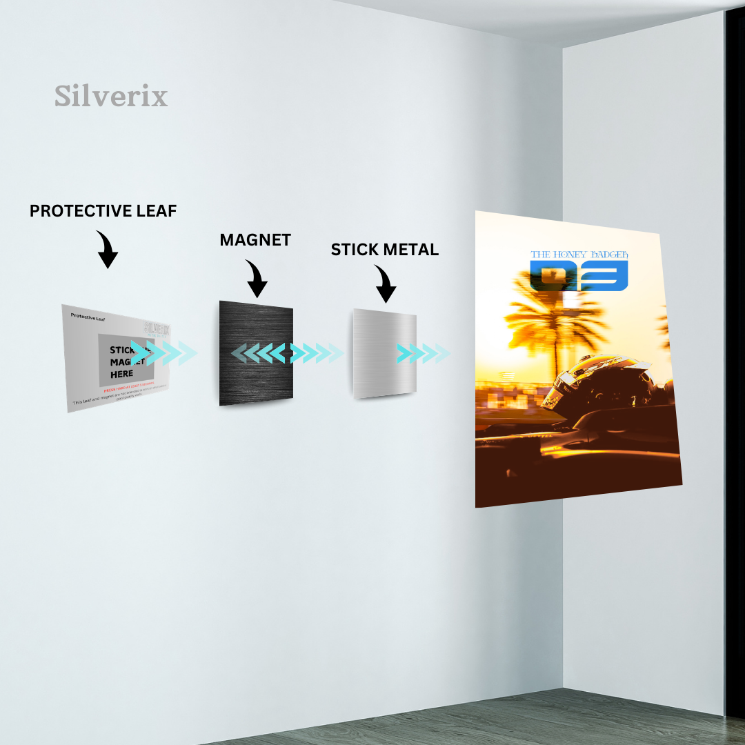 ⚠️ Ensure the position is final before applying, as the adhesive is strong. Step 4: Attach the Poster Magnet Attach the matching magnet securely to the back of the aluminium poster. Ensure correct alignment with the wall magnet. Step 5: Mount the Poster Align the poster magnet with the wall magnet. Gently place the poster onto the wall. The magnets will connect automatically, holding the poster securely.