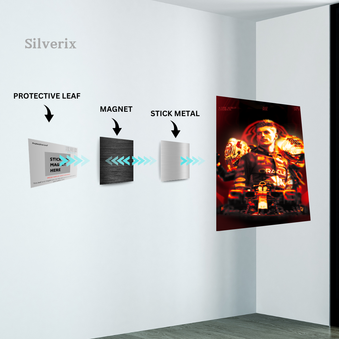 Crafted for Durability & Elegance – Printed on sturdy aluminium with a modern matte finish, your custom metal poster boasts crisp colours and sharp details. The magnetic mounting system ensures easy, damage-free display, allowing you to mount and move your poster in seconds.